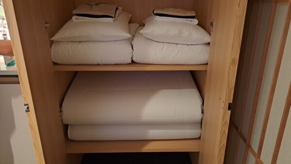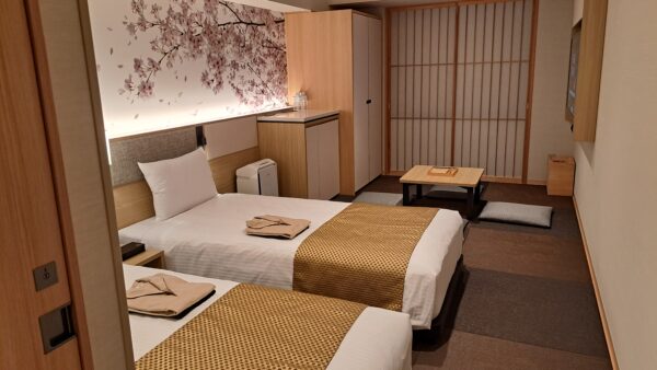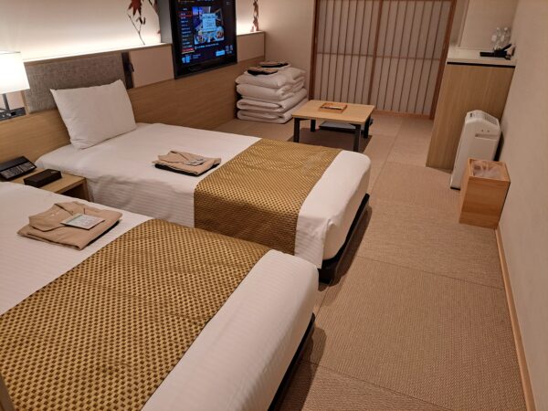 We stayed in a Japanese-Western Room (29㎡), which fits 4 people with 2 beds and 2 futons. Beautiful tatami flooring—very Japanese!